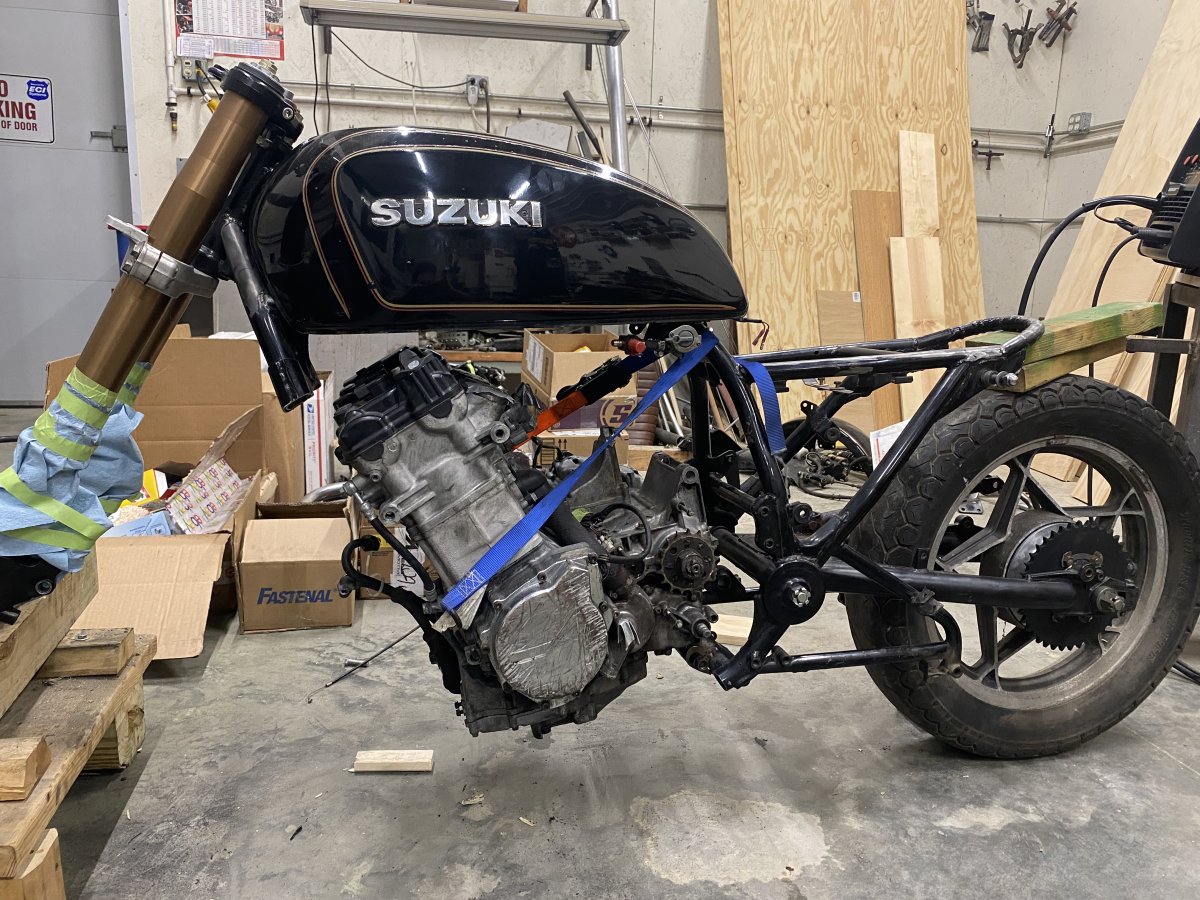 So for those of you not familiar with my project, I’m swapping the engine from a Hayabusa into a 1980 GS850 frame. Now is where I need some input from the people with some build or swap experience. I need to know the most lean angle I can get away with forward or backward on the engine without drowning the crank in oil or starving it of oil, and I know it’s probably not ideal for proper fuel atomization but I’m looking for a boot between the intake side of the head to the throttle bodies that runs at a 45° because of space constraints. And information, expertise, or constructive ideas are appreciated! (Also to note in the pics the back of the frame is lifted an inch or two so the tank isn’t sitting on the TB’s and I need to get the back of the engine sitting closer to the swingarm pivot for a better route for the chain to avoid any mechanical interference, these are just initial mock-ups to dial the placement in)