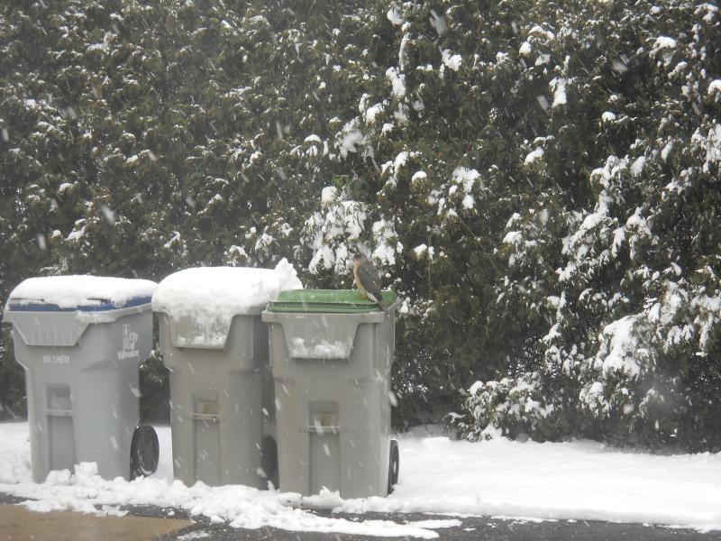 Strange, I just had one on my garbage can the other day. I live in the city too, kinda weird. He's out there quite often, just odd that he was sitting on my garbage cans of all places...