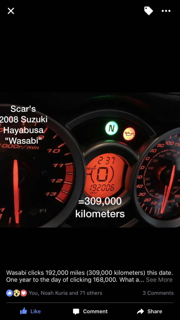 My 06 model I bought in 07 had done only 15500 kms , I kept it till 2010 , when traded I clocked just over 180000 kms. Only did CAM chain at 110000 and the starter motor at 150000.Who has the highest miles on their hayabusa? I came from the SV forums and several people are over 100,000 miles. Two guys have over 130,000 ..