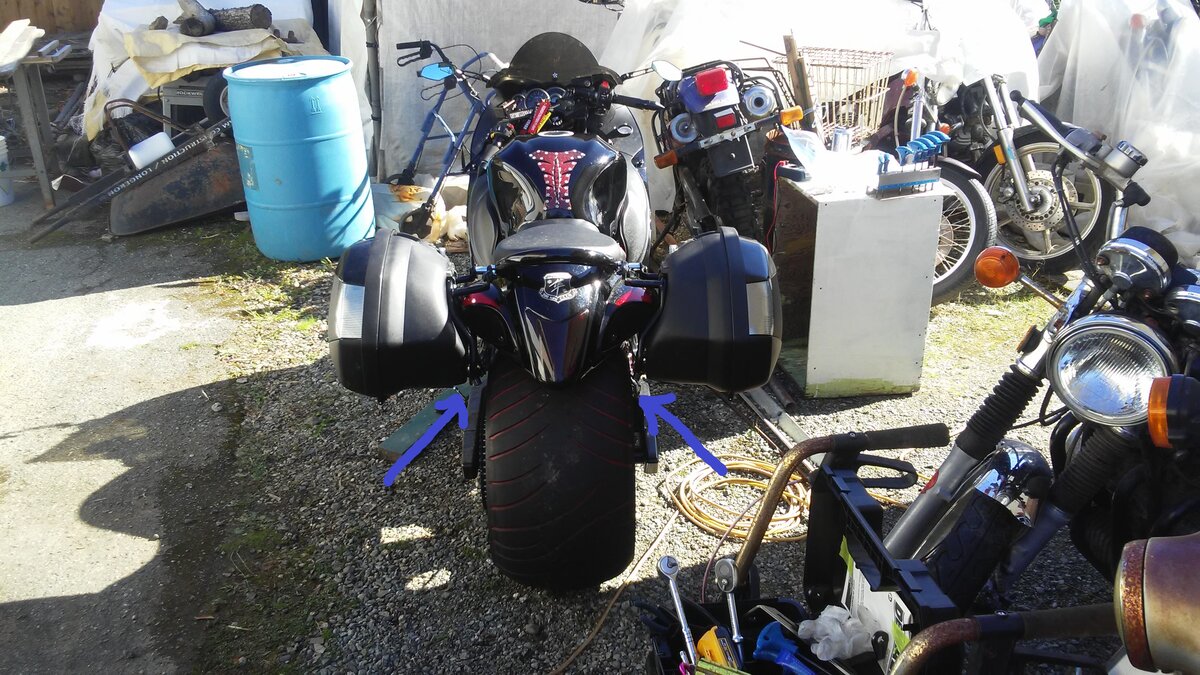 Well the new hardware for the top case requires removal of the grab rail,can't use it. Oh goodie. So I make the bag frame and the top case frame share the same front mounting point by over lapping them.Looks decent. The 2 are spaced out,away from the body work.
