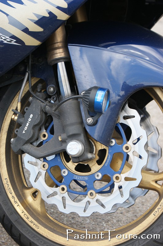 ) AND my all new custom F/R anodized/engraved Galfer Wave Brake Rotors coupled with Novice Race/Ceramic Galfer Brake Pads (G1375) - Wow! It wasn't till the 3rd straight day of riding twisties that I realized I'd only been using one finger to stop the bike all day. One finger for a loaded up 600 lb bike with 170 lb rider is simply awesome! Couldn't do that with the stock, and the brake fade with stock was terrible after the fluid got hot.